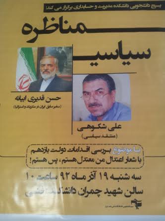 کرج: دانشگاه آزاد گوهر دشت - مناظره با آقای علی شکوهی پیرامون بررسی اقذامات دولت با شعار اعتدال. ساعت 10 صبح به دعوت بسیج دانشجویی.