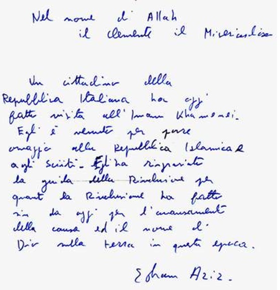 متن زیر دستخط ادواردو به زبان ایتالیایی است. متن زیر پبشنهاد ادواردو به عنوان متن خبر ملاقات او با حضرت امام (ره) می باشد. . ملاقاتی که در 8 شهریور 1360 در حضور حضرت آیت الله خامنه ای – هاشمی رفسنجانی – مرحوم حاج احمد خمینی و آقای فخرالدین حجازی انجام شد. چون قرار نبود نام ادواردو ذکر شود این ملاقات جنبه خبری نداشت و لذا متن زیر تقدیم دفتر امام (ره) نگردید.
