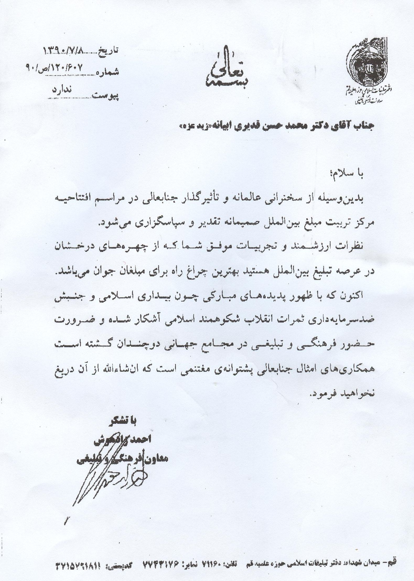 بدین وسیله از سخنرانی عالمانه و تاثیر گذار جنابعالی در مراسم افتتاحیه مرکز تربیت مبلغ بین الملل صمیمانه تقدیر و سپاسگزاری می شود.