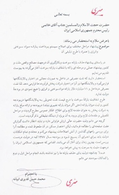[44] - از آنجا که طبقهبندی نامه مذکور توسط شخص اینجانب به عنوان شخصیت حقیقی سری تعیین شده بود و اینک اشکالی در انتشار آن نمیبینم، آن را منتشر مینمایم و اینکار از نظر حقوقی انتشار اسناد محرمانه دولتی محسوب نمیگردد.